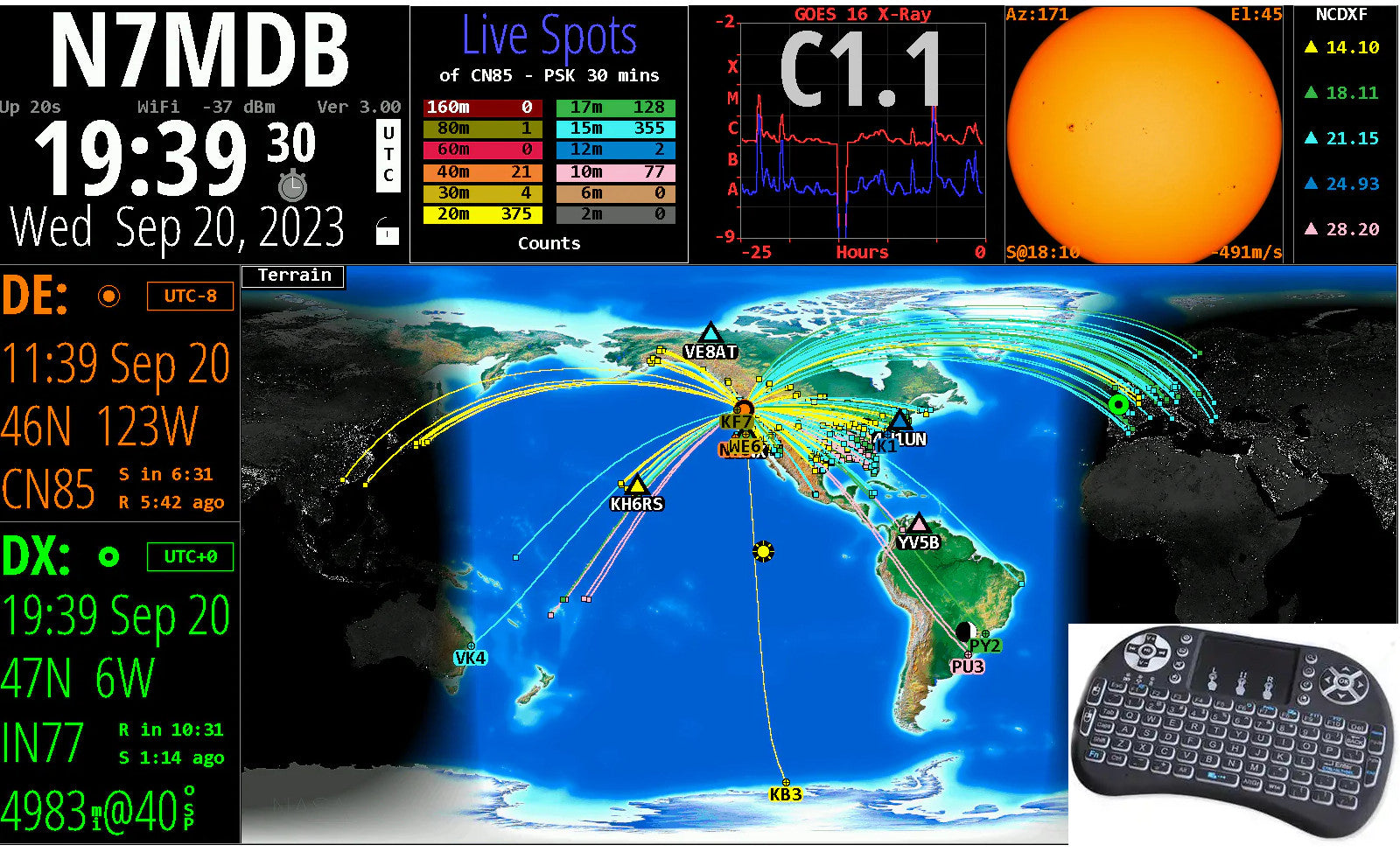 Our Quadra4K PC bundle featuring the fantastic HamClock by Elwood Downey. Gives you everything you need to run HamClock (will always auto-update to the latest) on a 1080p or higher resolution TV or monitor. Includes the Quadra4K PC, a mini wireless keyboarad/trackpad, HDMI cable, and USB power adapter & cable.